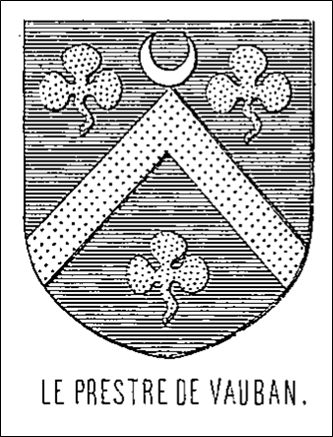 Le Prestre de Vauban. D’azur au chevron d’or accompagné de 3 trèfles de même et un croissant d’argent en chef - Cliquez pour agrandir